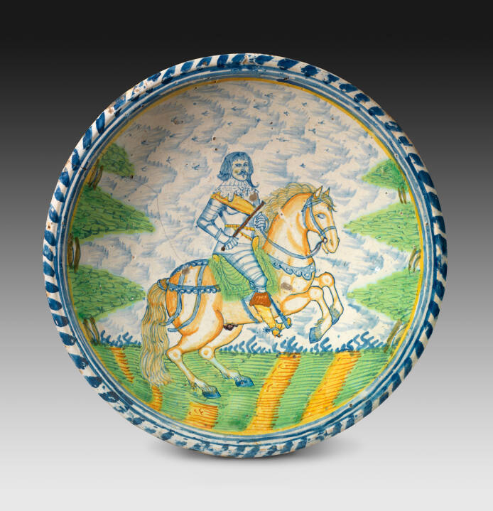 DescriptionEquestrian figure of uncrowned Charles I wearing armor, Van Dyck collar, yellow sash and top boots, and holding baton. Mount buff with blue and green accoutrement. Background: edged with green trees, blue clouds with high flight of birds; foreground: green and orange. Blue and yellow linear borders, blue-dash rim.Gallery LabelThe use of political motifs on 17th- and 18th-century ceramics is much like today's use of political imagery: to display loyalty to a political party or cause. Many of the images of English royalty on the objects in this case were inspired by popular paintings and prints that were translated onto ceramic objects. The large dishes in this case, called chargers, were primarily decorative pieces though they may have been used for serving on special occasions.