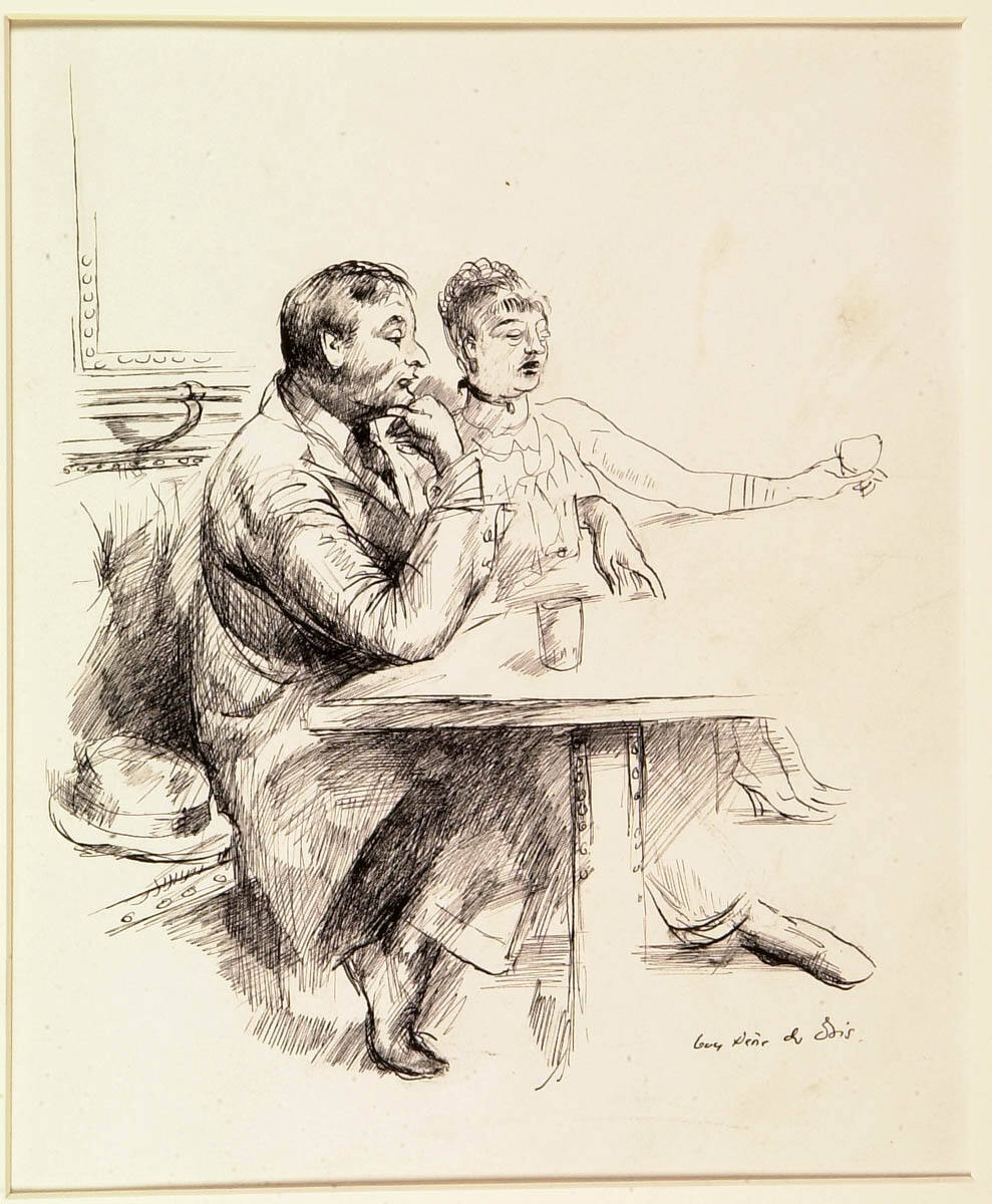 DescriptionMan and woman seated on banquette, mirror on wall above them. Hat on seat, l., beside man, whose r. hand is under chin. Woman's l. hand, extended, holds champagne glass. Tumbler in c. of table in front of man. Table has central support, behind and in front of which two figures' legs and shod feet are visible.CopyrightThis work is copyrighted. Contact the copyright holder for permission to reproduce.