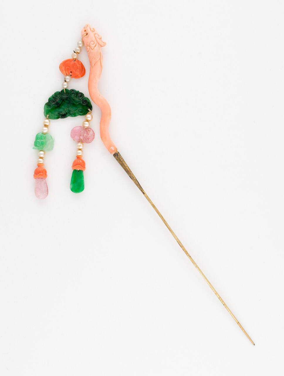 DescriptionCoral dragon with pendant of jade, pearl and rose quartz on a gold pin.Exhibition HistoryManchu Court Art, Stanford (CA) University Museum, mid-November 1954-February 6, 1955.