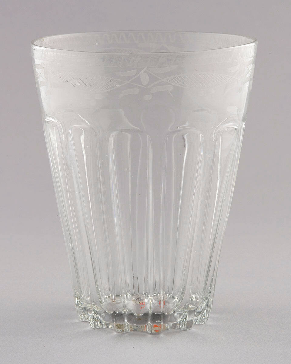 DescriptionClear flint glass, broad sunken panels with delicate etched band of latticed ovals, dots and petals above.