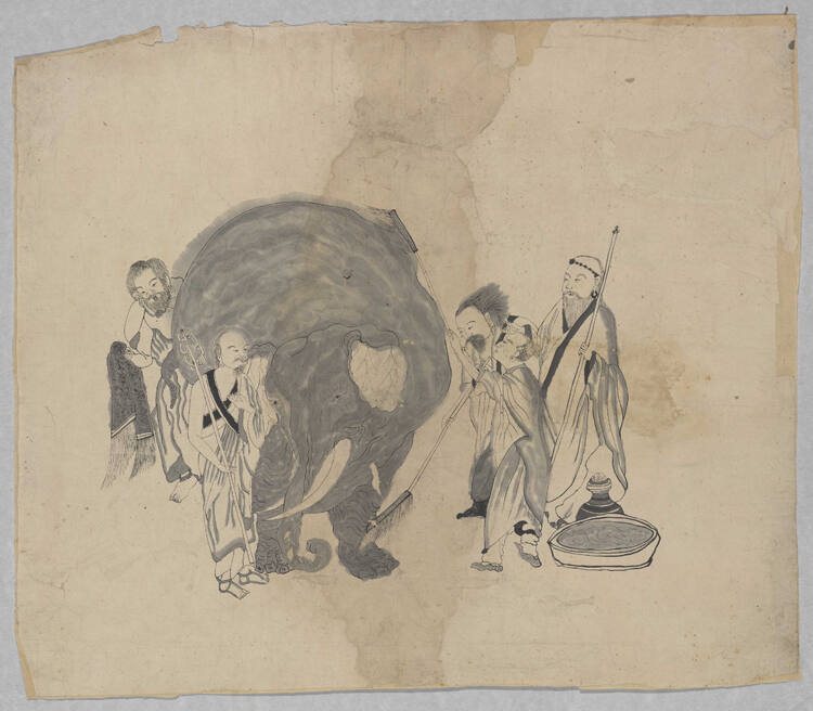 DescriptionElephant with five robed attendants, two wielding brushes, cleaning.