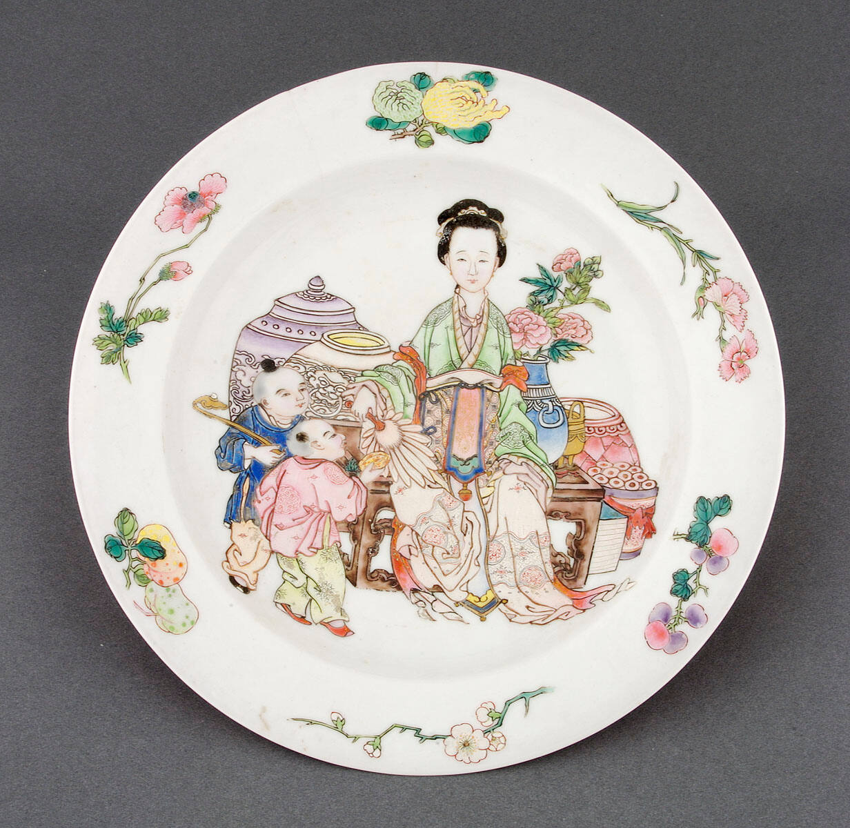 DescriptionRuby-back plate with famille rose enamel decoration: lady seated on a bench and two boys. Border of floral and fruit design. Light blue, rose and green on white ground.