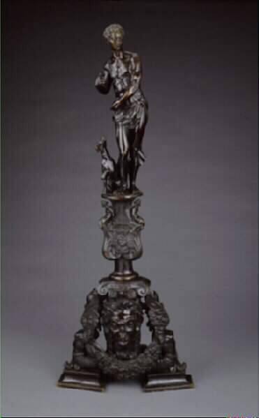 DescriptionBase: each has two front feet with a winged term facing side; between outer wings, central swag, above which bearded mask topped by double Ionic capital. Shaft circled by three reliefs bearing Medici coat of arms flanked by leaf scroll, surmounted at each side by a nude female half-figure. Each crowned by a standing figure: 1. Meleager with a dog; 2. Atalanta or Venus with Putto.ProvenanceBaron Salomon Albert Anselm von Rothschild (1844-1911), Vienna, by 1911 [1];