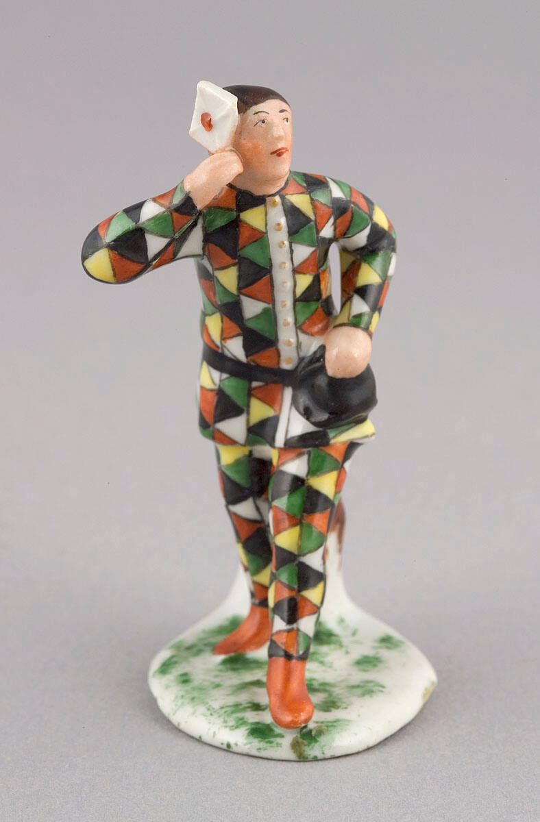 DescriptionItalian Comedy figure of Truffaldino type; standing figure with left foot forward, leans against tree trunk; holds letter with right hand to head; left holds black hat; clad in multi-colored patched suit with black belt and red shoes; in red on bottom: "217".