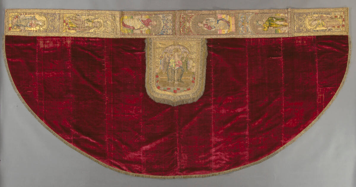 DescriptionCape of red silk solid cut velvet orphreys and hood of linen embroidered with polychrome floss silks and silver-gilt thread in split, encroaching satin and stem stitches; or nué, laid-and-couched work, and couched work, partially padded. On the hood: the Virgin Mary holding the Christ child, flanked by angels. On the orphreys: (left) unknown male saint (right) Virgin and Child with saints.Exhibition HistoryThreads of Gold: Brocades and Embroideries for the Church, Spencer Museum of Art, University of Kansas, Lawrence, KS, July 2-September 1, 1985, no. 14.