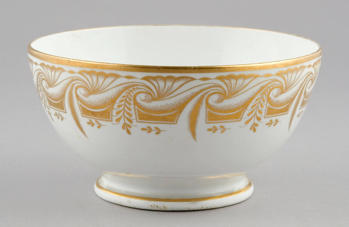 DescriptionRound bowl of white porcelain with wide border of gilt in formal design and continuous leaf pattern around top.Provenance