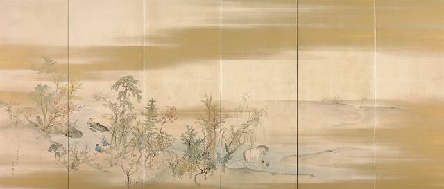 MediumOne of a pair of six-fold screens; ink, color, and gold paint on paper