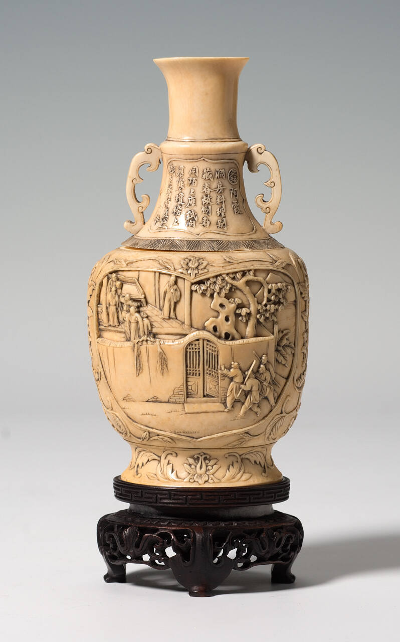 DescriptionAn off-white carved small baluster-shaped ivory vase. The neck is decorated with panels of carved poems, one about A Hsi on one side and one about Ch'en Hsi-chiu on the other. The body is carved with figural scenes: on one side are armed men entering the gate of a walled compound wtih a family inside a pavilion; the other shows a wheeled donkey cart acosted by three persons. Pair with F97-37/6.