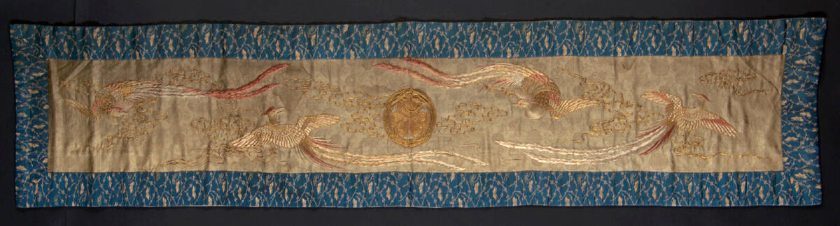 Tablecloth made over from a Buddhist temple altar cloth (uchishiki) with a design featuring the crest of the Tokugawa family and long-tailed birds