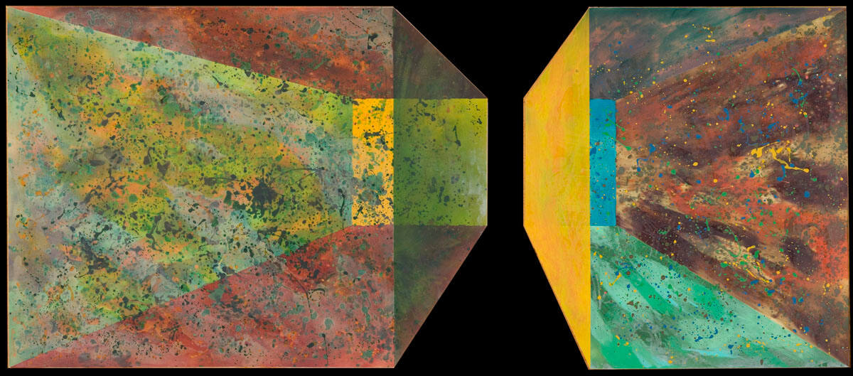 DescriptionTwo hexagonal segments, each giving the illusion of being a rectangular solid, strongly foreshortened sides at center of composition. Transparent shades of red, blue, green, and yellow correspond to the various sides of the volumes. The left segment is mottled with splashes of black paint; the right segment, red, yellow, blue, and black paint.Copyright© Ron Davis
