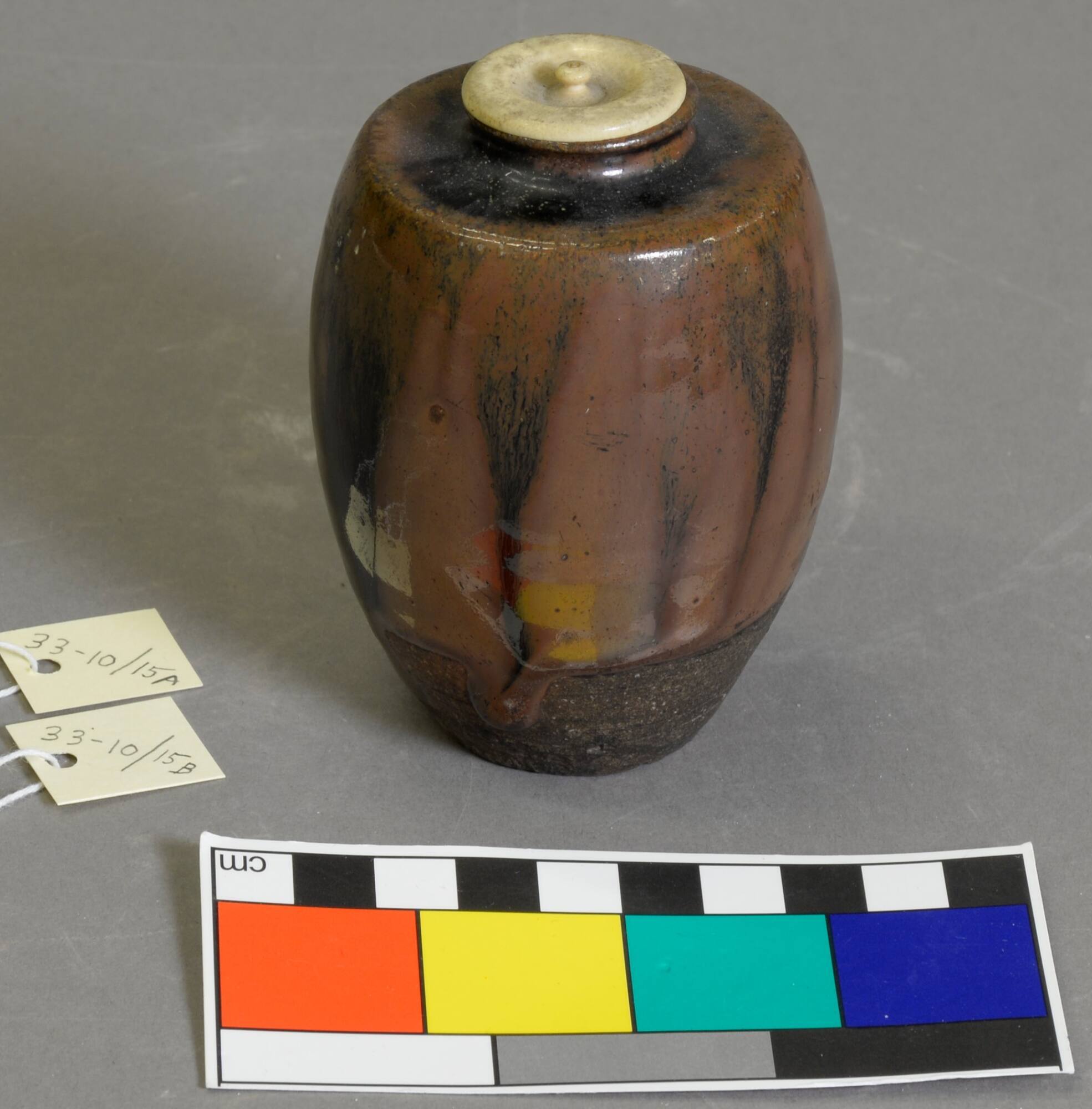 DescriptionOn the greyish brown clay body are thread marks and a light brown underglaze with splashes of darker brown. With a lid.