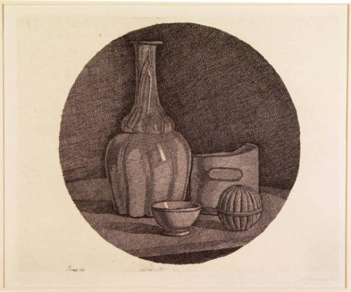 Gallery LabelRendered with subtlety and nuance, these clustered vessels reveal Giorgio Morandi’s masterful ability to depict forms with light and shadow. To achieve the full range of tones in this etching, Morandi varied the density of lines drawn through an acid-resistant layer covering the circular copper plate. Then, he varied the length of time that the exposed copper lines were etched in an acid bath. Morandi taught the printmaking process at the Accademia di Belle Arti in Bologna, Italy.