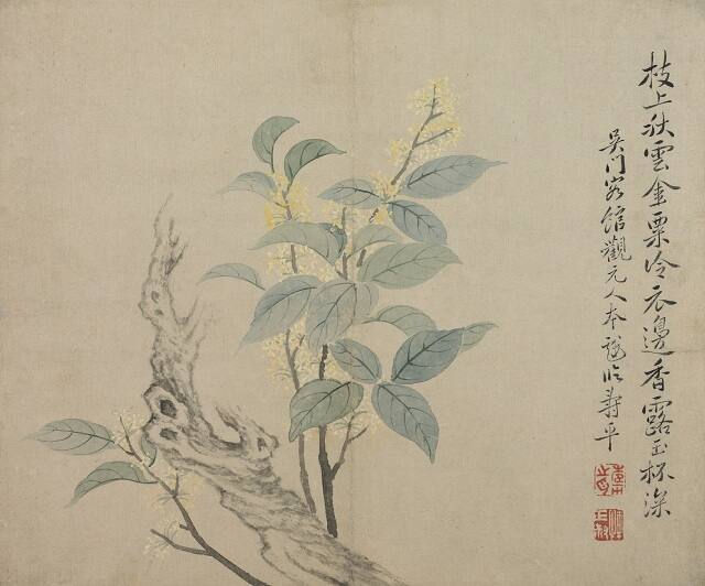 "Like autumn clouds upon a branch, the golden husks look cold; fragrant dew, from their deep jade cups, brushes my robe. Playfully copied after a Yuan dynasty version I saw in the Wumen guesthouse." – Yun Shouping