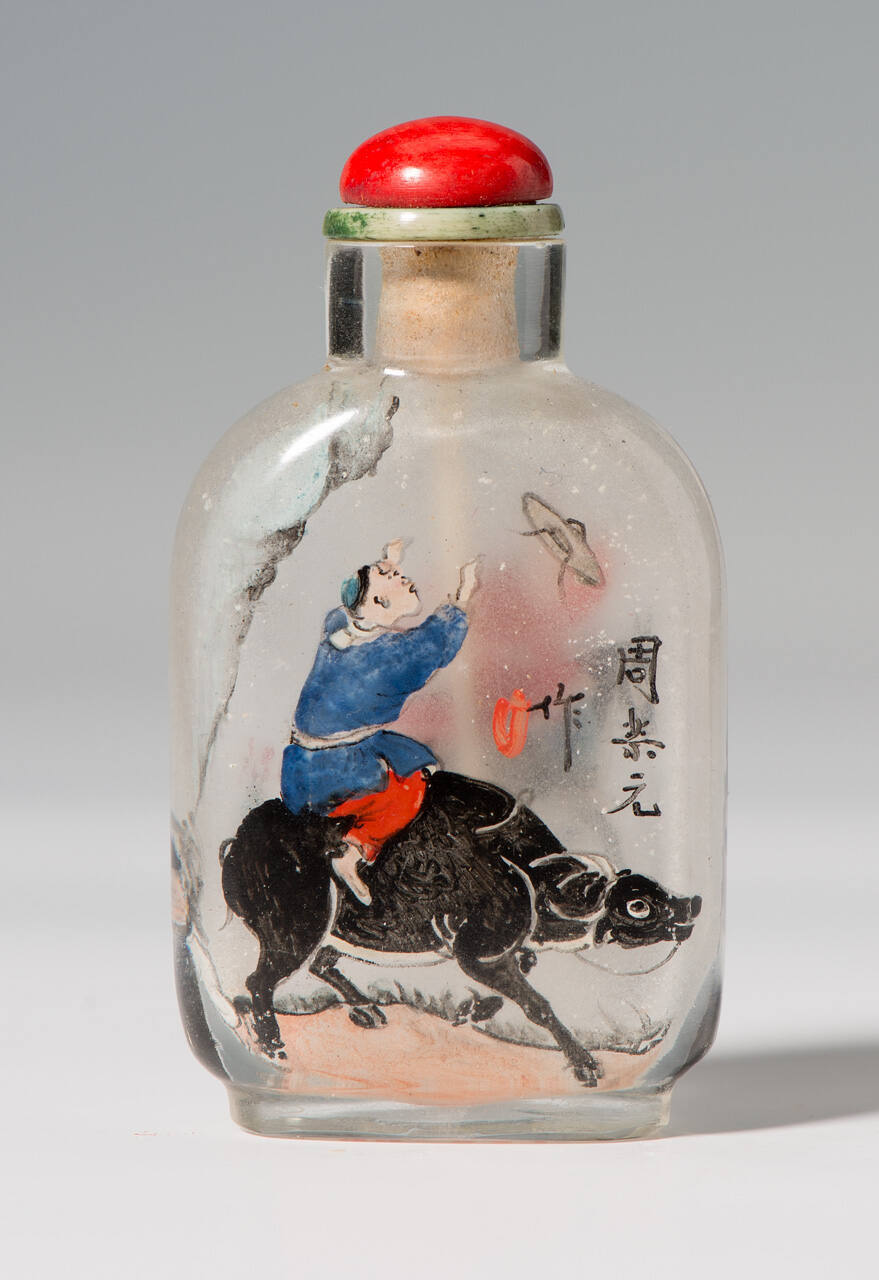 DescriptionOpaque white glass with painted designs on each side. Front: man riding mule. Reverse: Boy riding a buffalo as his hat blows off. Red stopper.ProvenanceElla Anna Loose (née Clark, 1860-1945), Kansas City, MO, and Washington, DC, by 1934 [1];