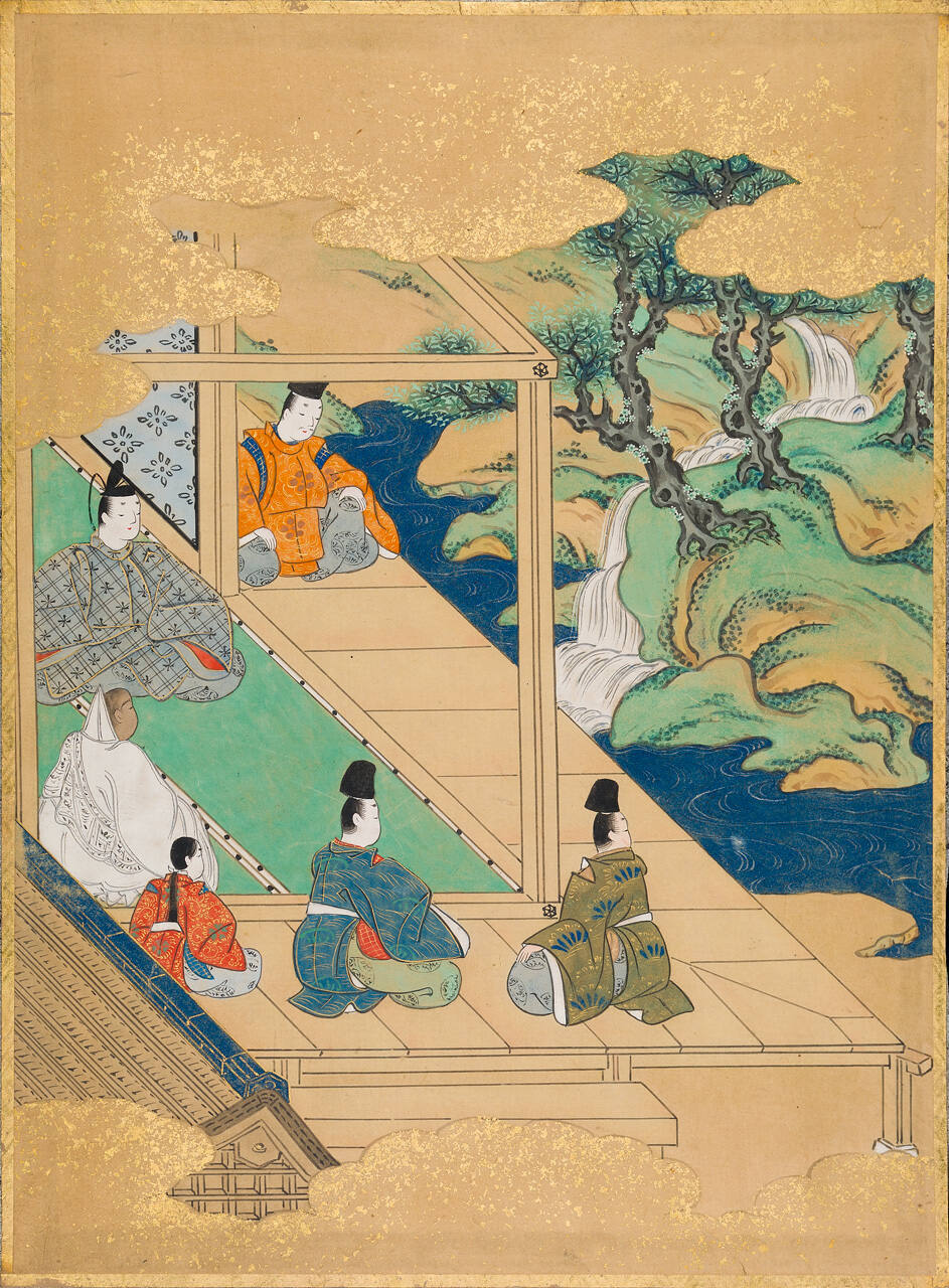 DescriptionTsuneyuki presented the Prince with a beautiful rock that had a poem written on the side with green moss.Gallery LabelThe Tales of Ise, compiled in the 10th century, is one of Japan’s most celebrated poem novels. It consists of 125 episodes that intersperse the biographical narrative of a courtier-poet, Ariwara no Narihira (825–880 C.E.) with his romantic poetry. Illustrations to the episodes became popular in the 17th century. These paintings are closely modeled on a famous woodblock printed set, the Saga bon edition, published in 1608, that has been reprinted many times since.