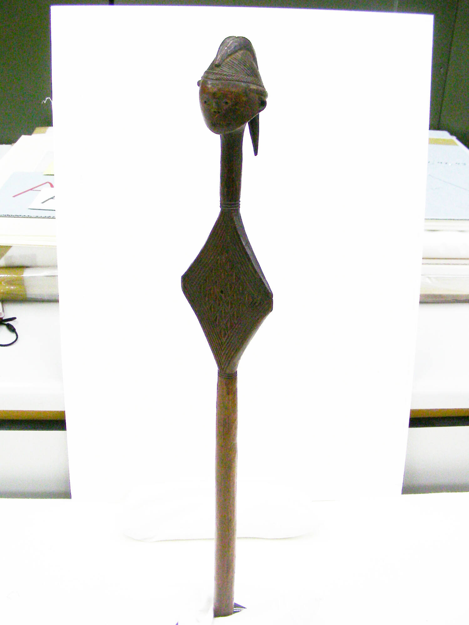 DescriptionStaff finial with a diamond shape in center, topped by a head with coiffureProvenanceWith Jacques R. Van Overstraeten (b. 1954), Brussels, Belgium [1];