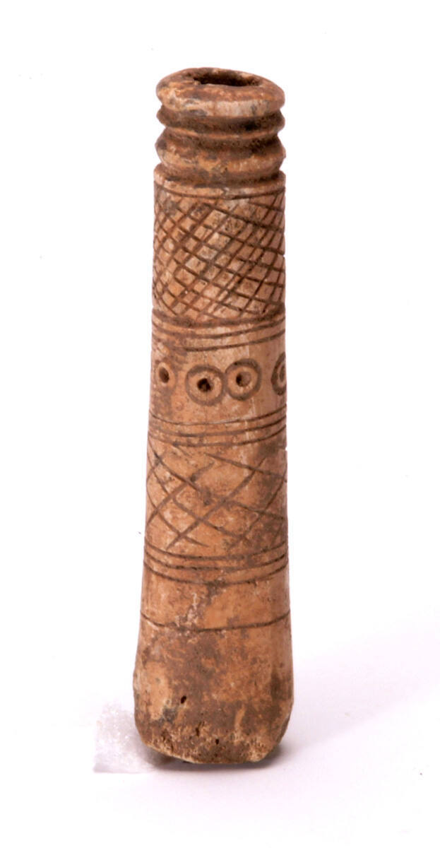 [1] The Nelson-Atkins and the Pacific School of Religion co-sponsored an archaeological expedition at Tell en-Nasbeh, northwest of Jerusalem, in 1932. The expedition was led by Dr. William Frederic Badé. This object is published in the excavation report, C. C. McCown, Tell en-Nasbeh, Vol. I: Archaeological and Historical Results (Berkeley and New Haven: The Palestine Institute of Pacific School of Religion and the American Schools of Oriental Research, 1947), 303, Plate 112 no. 17, (repro.). An excavation inventory card ("millimeter card") for this object, held by the Badé Museum, Pacific School of Religion, Berkeley, CA, describes the piece as an "Incised bone knife (?) handle" and documents its findspot as Tomb 53, North Cemetery, on June 20, 1932. Copy in Nelson-Atkins curatorial file. With thanks to Dr. Melissa Cradic, Curator, Badé Museum, for sharing this information with the Nelson-Atkins.