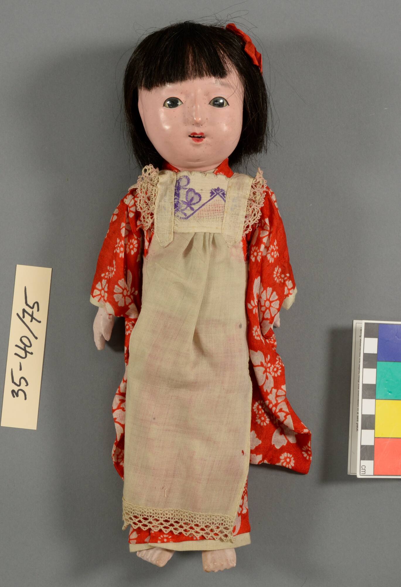 DescriptionGirl in red and white flowered kimono with blue sash, white apron, black bobbed hair with red bow.ProvenancePearle Scales Moore (1867-1934), Peoria, IL, by 1934 [1];
