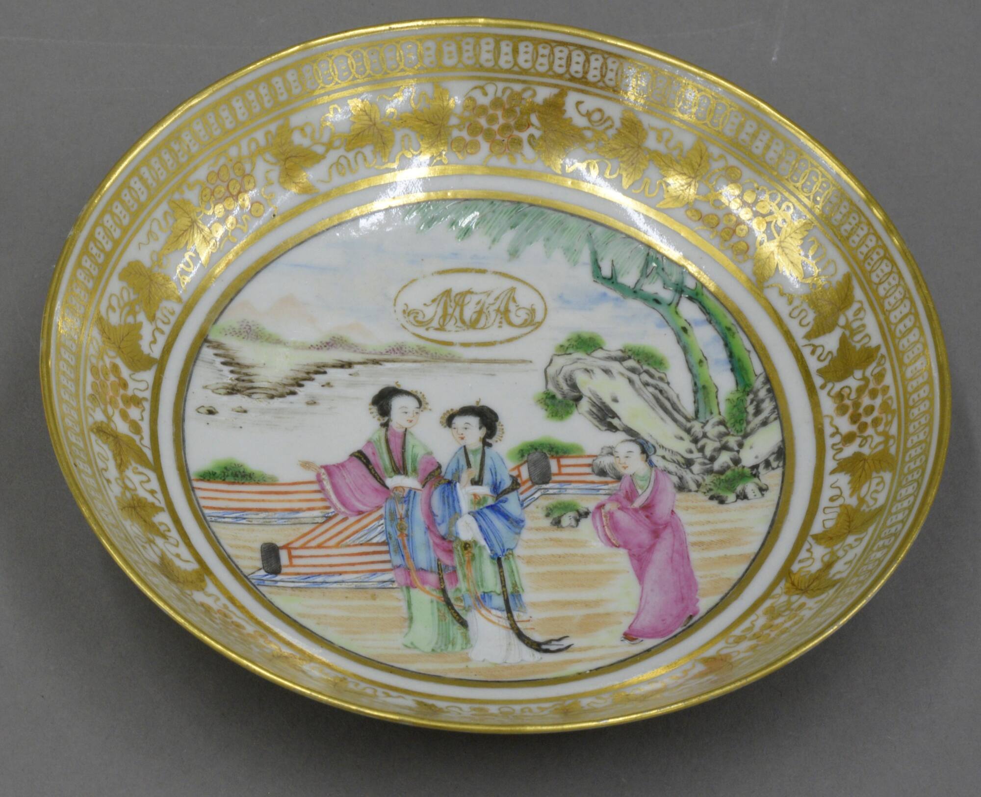 DescriptionPart of 77 piece tea service. In bottom of saucer, on exterior sides of cups is a scene painted in famille-rose style stowing 2 Chinese ladies and attendant in garden. Above figures is gold monogram, MTA (?) in gold oval. On interior sides of all pieces is border design in gold of grape bunches and leaves. On handleless cup on exterior side is also a gold spray of leaves and berries.