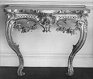 DescriptionThe entire exposed surface is gilded. The front and side friezes are pierced trellises. The central cartouche is of acanthus leaves as are the corner cartouches above the knees of the cabriole legs. The legs are carved with small acanthus scrolls. Below the trellis on both sides of the central cartouche are swags of flowers (with screwed-on braces on the back). Surmounted by mottled grey and red marble slabs of conforming shape.