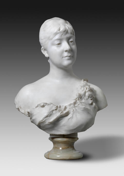 Sold at her posthumous sale, Magnifiques Joyaux, Cinq Colliers de perles, Collier Jardinière en brillants, perles et pierres de couleur, Parures en Emeraudes, Saphirs, Rubis, Perles, Dentelles, Lingerie, Garde-Robe, Éventails, Boites; Objets d’Art et de Riche Ameublement Époque et Styles Louis XV et Louis XVI, Nombreuse Argenterie Artistique et de Table; Tableaux Anciens et Modernes, Tentures, Tapisseries, Étoffes Dépendant de la succession de Mme Léonide Leblanc, Hôtel Drouot, Paris, April 24, 1894, no. 361, as Beau buste en marbre de Mme Léonide Leblanc;