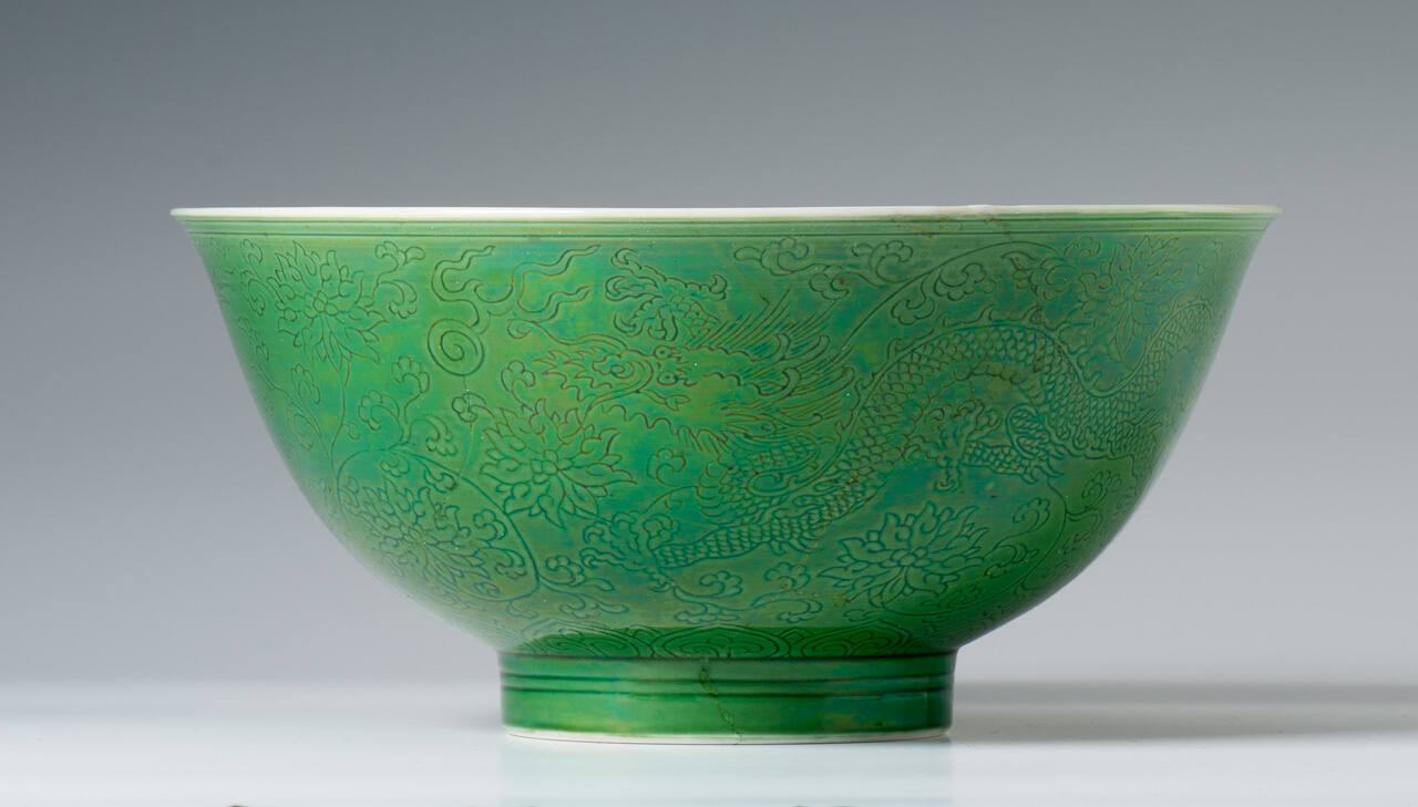 DescriptionOne of a pair of bowls with a green glaze on the outside and white on the inside, with an incised design of dragons and lotus under the green glaze.