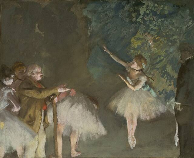 Edgar Degas depicted the ballet in a modern way, in both its splendor and triviality. Here, the artist contrasts the graceful movements of a dancer with the awkward poses of ballerinas adjusting their costumes in the compressed space. Degas also juxtaposes the young women in frothy frocks with the commanding air of the old ballet master to the left and the sinister appearance of the dark-suited, wealthy observer to the right.