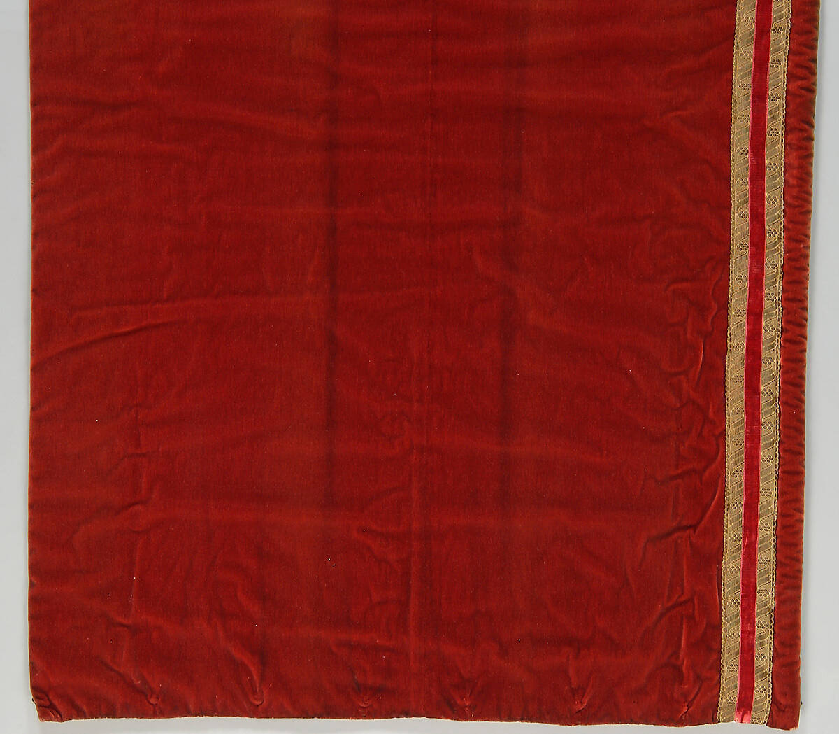 DescriptionTwo pair old rose velvet window hangings. Trimmed with gold braid, lined and innerlined.Provenance