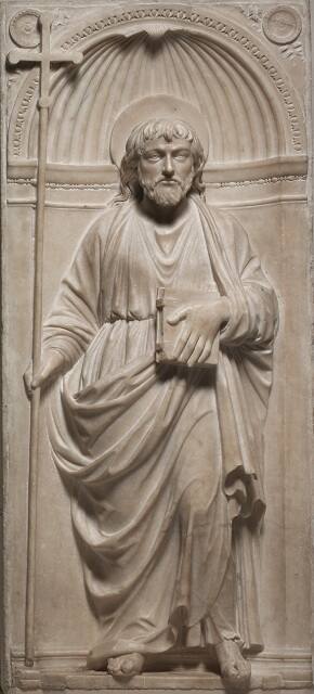 [1] This sculpture, along with its pendant Saint James the Less (F61-67), has generally been considered to be among a group of monuments commissioned by Cardinal Guillaume de Perrier in the 1490s. This connection to de Perrier was first published in Antonio Muñoz, Pièces de choix de la collection du Comte Grégoire Stroganoff, seconde partie (Rome: Unione editrice, 1911), 122 and often repeated in subsequent publications. An alternative patron was proposed by Frida Schottmüller in Die Italienischen und spanien bildwerke des Renaissance und des Barocks in marmor, ton, holz und stuck , volume 5, Beschreibung der bildwerke der Christliche epochen (Berlin: Georg Reimer, 1913), 140-41, in which she suggests that these sculptures were commissioned by Cardinal Giuliano della Rovere (later Pope Julius II). Recent scholarship has continued this focus on Giuliano della Rovere as the patron. Michael Kühlenthal, in “The Monument of Raffaele della Rovere in Santi Apostoli in Rome,” in Claudio Crescentini and Claudio Strinati, eds., Andrea Bregno: Il senso della forma nella cultura artistica del Rinascimento (Florence: Maschietto, 2008), 214-15, suggests the reliefs were commissioned by Giuliano della Rovere as part of a monument honoring his father, Raffaele della Rovere, brother of Pope Sixtus IV, and that the monument was mostly dismantled and the reliefs removed in 1571 when Alessandro Riario installed an inscription in the same wall.