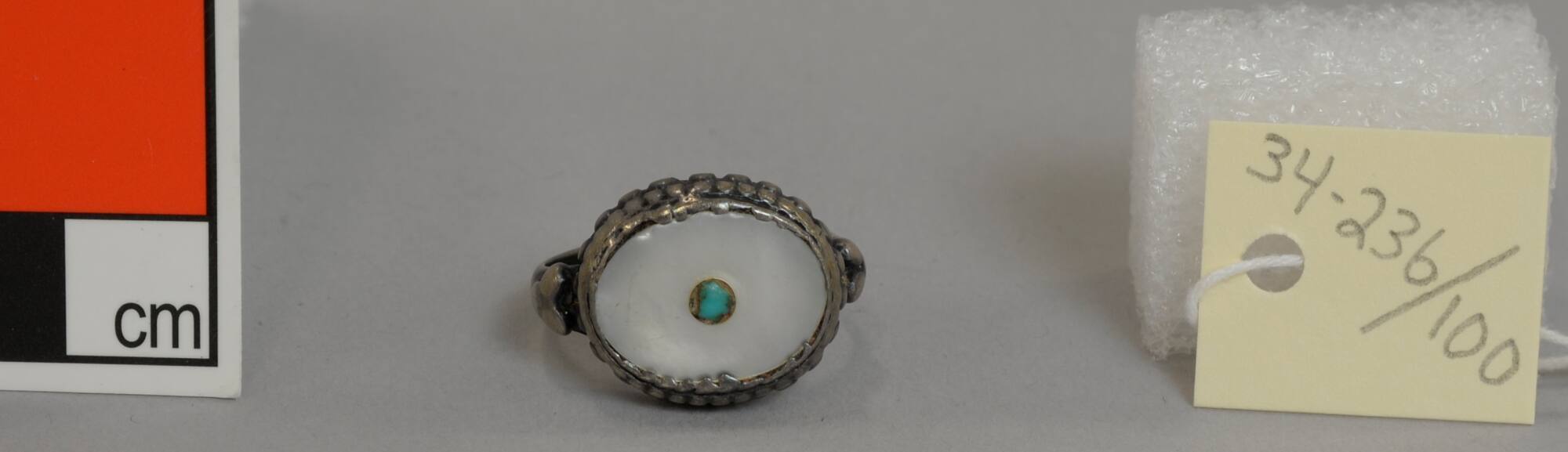 DescriptionSilver ring set with mother-of-pearl with small turquoise in center.ProvenanceElla Anna Loose (née Clark, 1860-1945), Kansas City, MO, and Washington, DC, by 1934 [1];