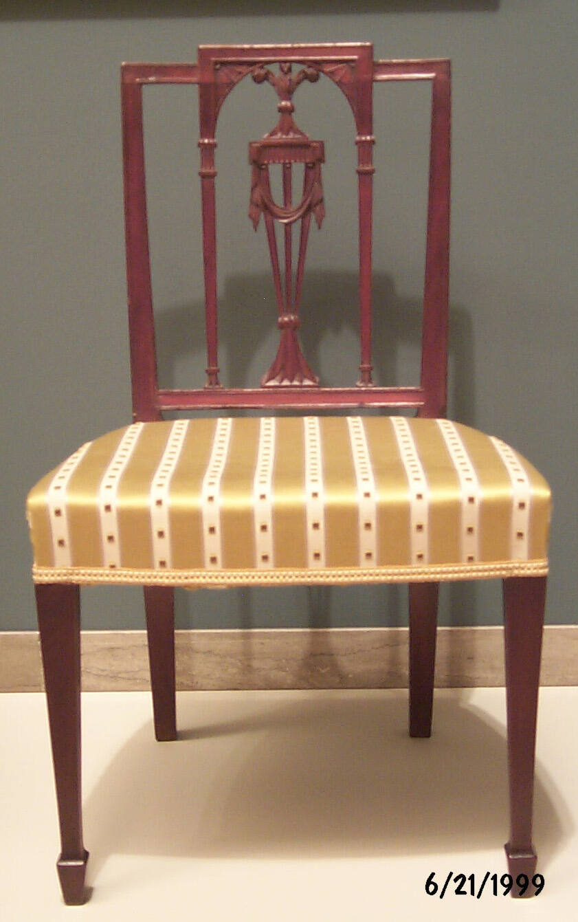 DescriptionSheraton-type chair with light purple brocade. Drapery and plume carved back.ProvenanceWith Ginsburg & Levy, Inc., New York, by 1934;