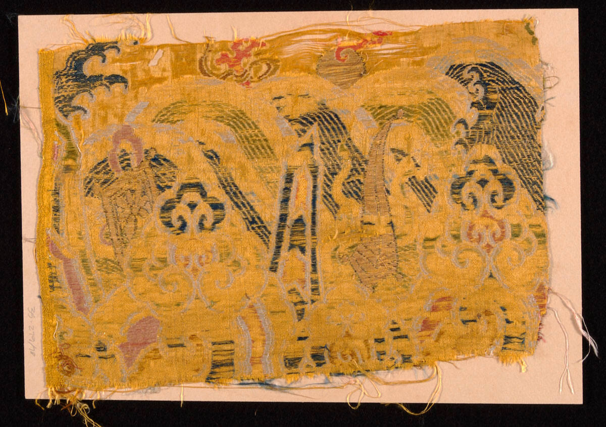 DescriptionPart of a Lama coat? Yellow silk brocaded in green, pink, white, blue and gold thread. Design of waves, clouds and two of eight precious things.