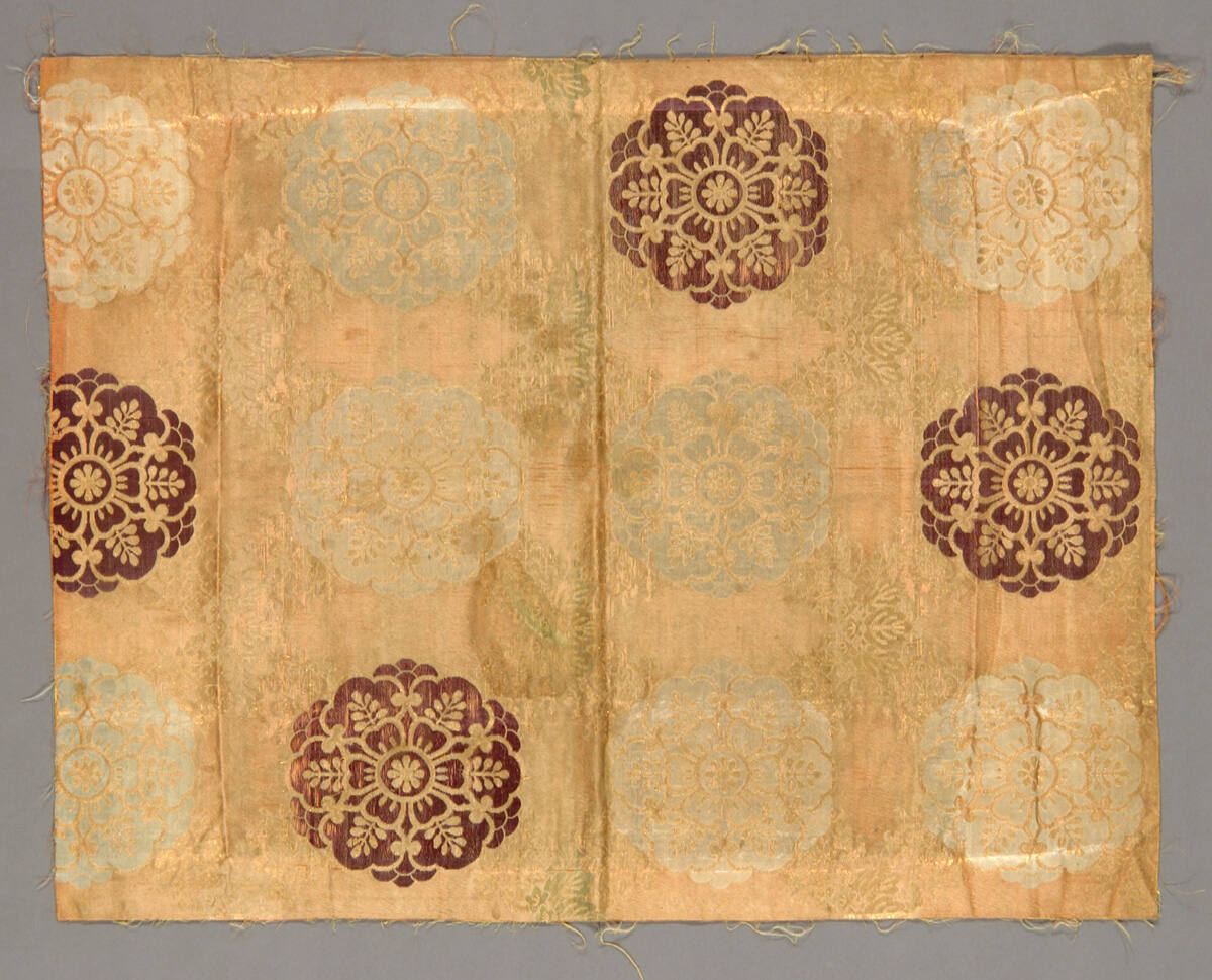 DescriptionGold-orange silk background brocaded in purple, white and gold and some green in repeated design of 6-petal flowers and acorn leaves in background. Yellow cotton lining.