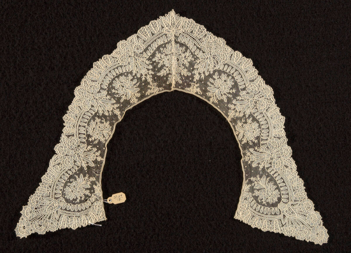 DescriptionNeedle lace of the point de gaze type. Straight center band swelling into oval ends. The edges outlined with stylized leaves-along the band-and flower heads-around the ends. Delicate floral sprigs are framed by S and C scrolls.Provenance