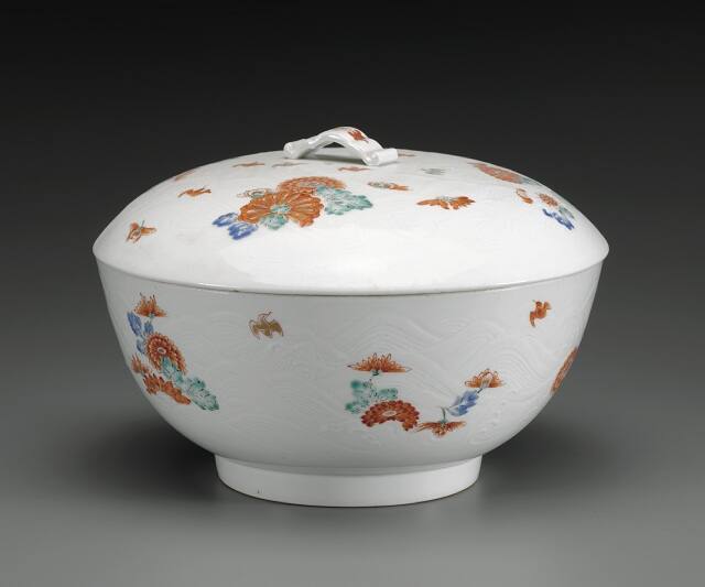DescriptionIncised and molded decoration of crested waves underglaze; overglaze enamel decoration with chrysanthemums and plover. phoenix and jewels in medallion.Gallery LabelKakiemon is a special type of delicately enameled porcelain produced at Arita, Japan’s premier porcelain production center. Kakiemon derives its name from the beautiful red persimmon (kaki) enamel color perfected by the Arita potter Sakaida Kizaemon (emon), whose descendants have perpetuated his artistic lineage into the present. The finish was enhanced by a special glaze that rendered the background a milky white color.