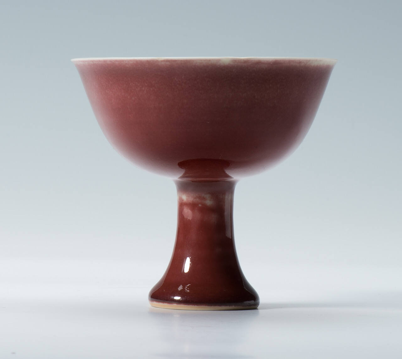 DescriptionPorcelain stem cup with peach bloom glaze. Interior and rim of bowl covered with white glaze.