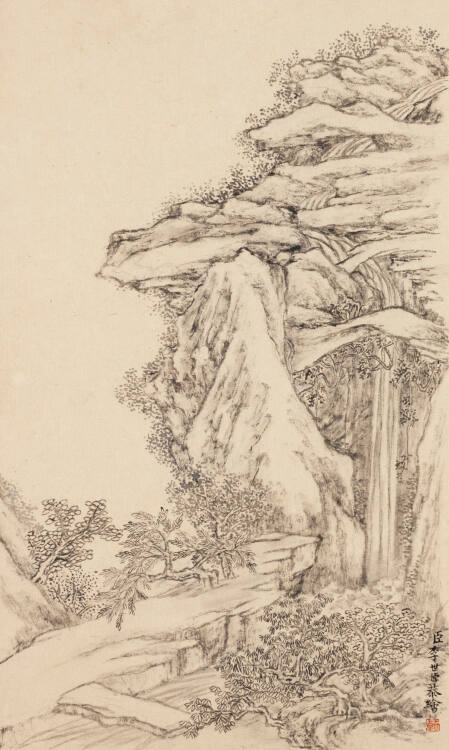 Gallery LabelLi Shizhuo was a Manchu official who learned brushwork from celebrated literati artists of his day. His paintings continue the classic landscape traditions, but at the same time, they demonstrate an individual sensibility in the dry brushstrokes that sculpt the boulders and cliffs and the fine lines that describe the curvilinear patterns of clouds and water. In general, his use of color also follows literati tradition, which employed it sparingly, more to add emotional intensity to a scene than to enhance its descriptive purpose. The bold use of flame red in the painting of sunrise, however, is unprecedented and seems to reflect a new interest in representing more realistically the shifting moods of nature.