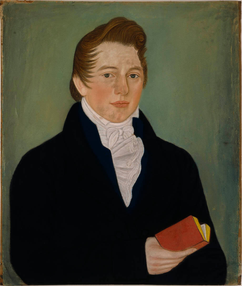 DescriptionHalf-length portrait of man with white stock and blue coat holding a red book.Gallery LabelFolk portraitist Micah Williams created striking portraits using pastels