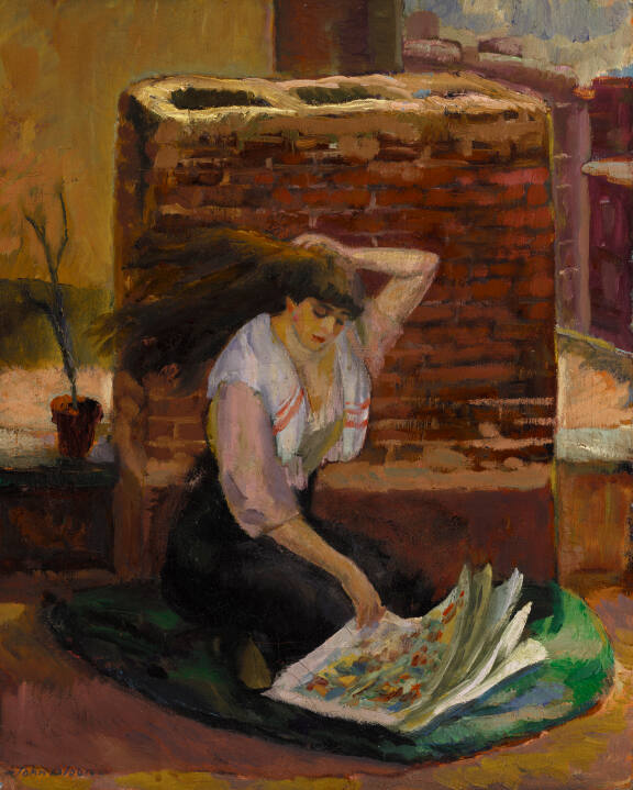 DescriptionPositioned centrally in the painting, a woman sits in front of a brick chimney and reads a newspaper on a rooftop. Her left arm is raised. A strong breeze blows her black hair and ruffles the pages of the paper. To the left of the chimney rests a potted tree, apparently quite dead. To the right, a section of a city skyline can be seen.Published References“Art: Exhibitions of the Week,” New York Times, 1 February 1925,