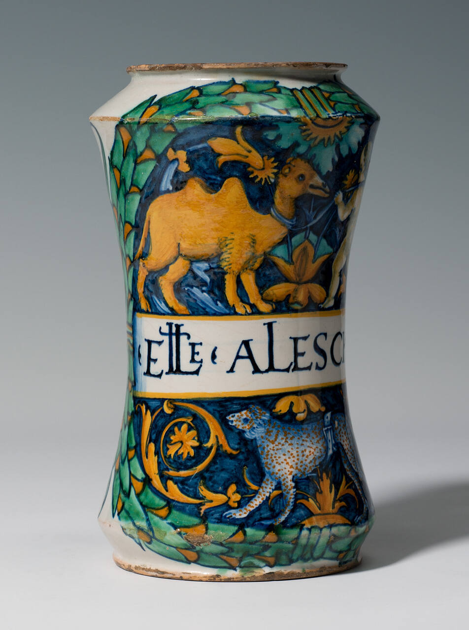 DescriptionAbove : Putti leading camel. Below: Fabulous animal. In center: Inscription, "Elle Aleschof". All surrounded by garlands. Colors: Green, yellow ochre, blue.Provenance