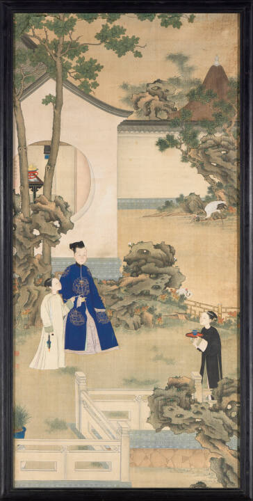 DescriptionWoman in blue brocade robe attended by two maids, one offering a pipe, the other, a cup of tea. Pavilion and crane in background; figures in a walled garden in the foreground.Exhibition HistoryMinneapolis Institute of Arts. "The Art of the Forbidden City," 1955.