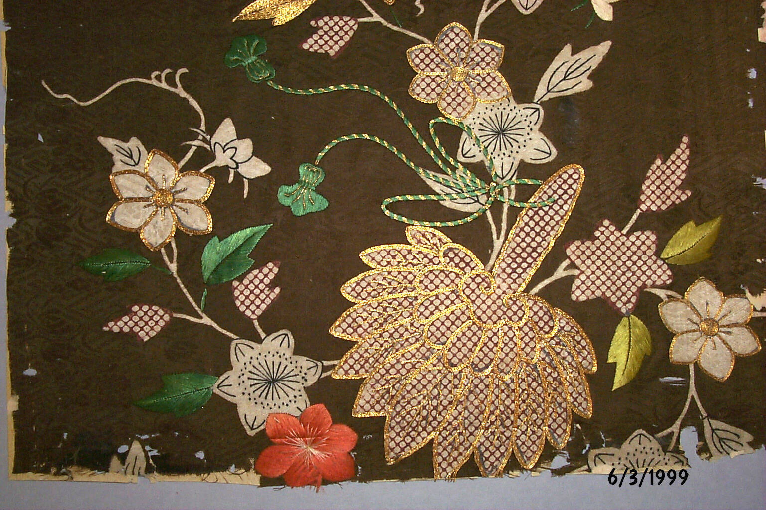 DescriptionBrown-figured satin ground with stenci tie dyeing, silk and metallic thread emboidery. Design of clematis flower and banana palm fans.