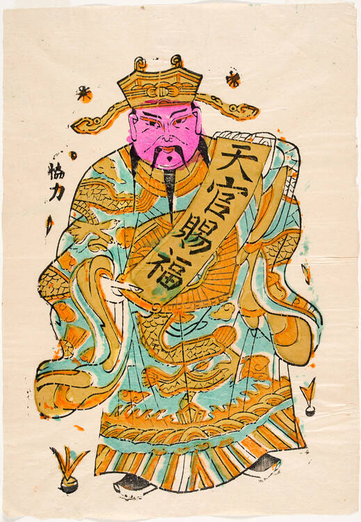 Complementing the martial door gods are these heavenly officials, who dress in the attire of imperial civil officials. They are assigned to watch the entrances of various rooms inside the house, where the doors are often beautifully designed with openwork like the wood panel here. These officials present symbolic objects that will bring wealth and honor to the rooms. Specifically, the official on the top print presents a scroll inscribed with blessings; the center pair presents a fish and a peach that symbolize prosperity and longevity; and the bottom pair amplifies the blessings with five children, each holding a lucky symbol.