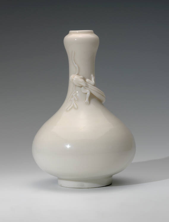 DescriptionBottle-shaped vase with a carving of a lizard encircling the neck, coated with a creamy white glaze.ProvenanceYamanaka & Co.;