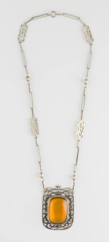 DescriptionChain in silver is composed of long narrow rectangular links of varying lengths, 4 silver balls, 4 flat rectangular links with floral design cut out. Pendant is piece of smooth topaz sandwich glass set in a silver band with two rope design narrow bands at base where it joins onto a flat backing of silver with the cut out floral design. On back of pendant is mark of two fish forming oval in which are inscribed the initials HBF.