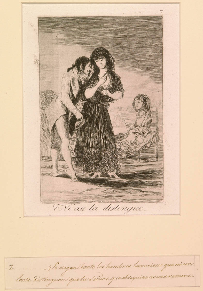 Tomás Harris, Goya Engravings and Lithographs (Oxford: Bruno Cassirer, 1964), 1: p. 96; 2: no. 42, p. 77, (repro.), as Ni asi la distingue. (Even thus he cannot make her out.).