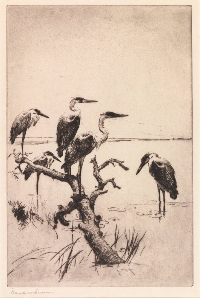 Due to etchings like Herons at Rest, Benson is credited with helping make wildlife prints a distinct genre.