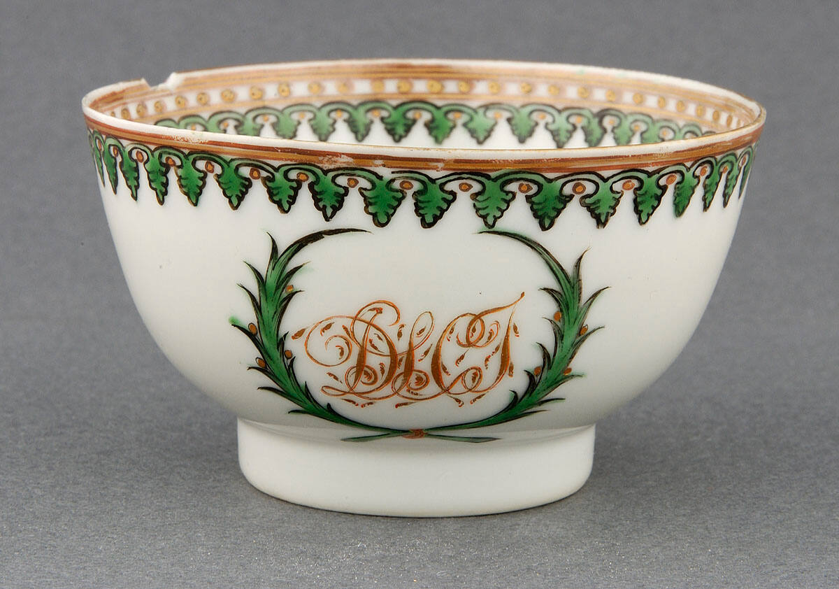 DescriptionCup without handle: white porcelain decorated with a band of enameled green and gold leaf designs on the inside and outside edges. On one side is a wreath encircling the initials DLCT. Saucer: white porcelain decorated with two bands of enameled green and gold leaf designs; in the center is a wreath encircling the initials DLCT.ProvenanceMargaret Cameron Chapman (née Mann, 1865-1935), Kansas City, MO, by 1935;