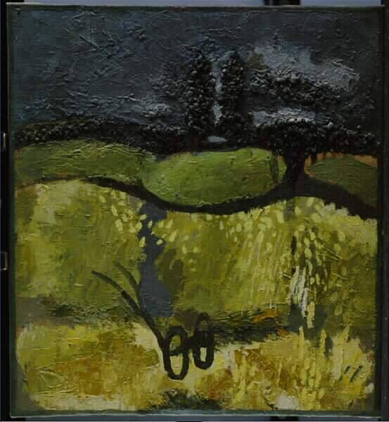 DescriptionThe recto image is of a landscape with upper quarter of scene gray with black encrusted trees below which is a band of green with black outline. Lower half is mostly green wtih lighter flecks. In left center is a black-outlined object with two circles and long handles resembling a plow. On the verso, the image is horizontal. A fragment of a still life scene with a bottom portion upper left corner a bottom portion of a brown vase; center with gray fork and two yellow apples; lower left corner a bunch of green grapes. Brown table edge parallel to bottom of canvas. Table top light brown.Copyright© Artists Rights Society (ARS), New York / ADAGP, Paris