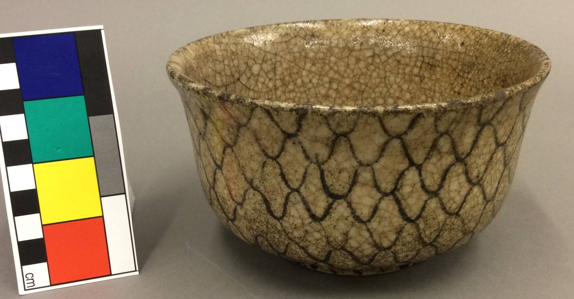 DescriptionFood bowl with net design and Japanese sticker that says Shi-no(?) ami(?)-e, probably made in Seto.